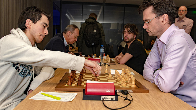 Aan het resterende live-board moesten twee LSG-ers het tegen elkaar opnemen. Michiel van Wissen koos met zwart voor een Benko tegen Mark van der Werf. Wit ging de meest theoretische paden uit de weg, maar zwart kreeg al vrij snel een prettige stelling waarin hij meer dan voldoende spel had. Uiteindelijk offerde zwart alsnog een pion met nog steeds genoeg compensatie, maar gebrek aan tijd deed de stelling steeds verder verslechteren. Net toen wit soepel leek te gaan winnen, liet hij opeens mat in 4 toe… wat werd gemist door de zwartspeler. Een enerverend potje voor de zaterdagavond.