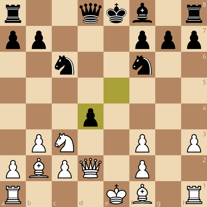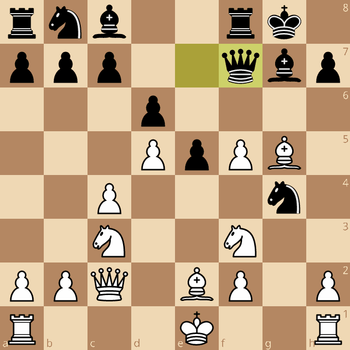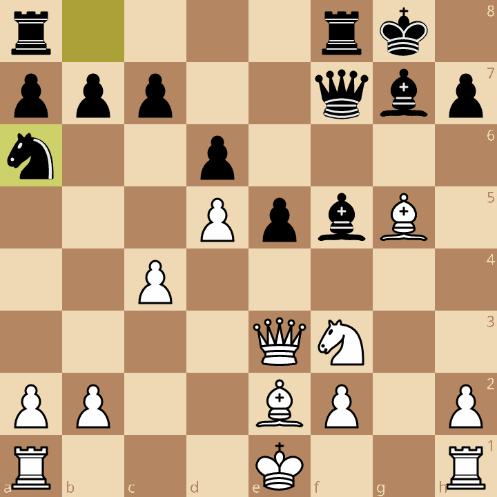 In deze stelling kan wit reeds groot voordeel krijgen door de afwikkeling 14.Ph4 Lxf5 (14..Ph6 14.f6) 15.Pxf5 Dxf5 16.Dxf5 Txf5 17.Lxg4 Txg5 goed door te rekenen. Nu kan wit met 18.Lc8 materiaal winnen (b7 valt) maar ook rustig 18.Le6+ Kh8 19.Pe4 is erg goed. De witte loper is beter dan de zwarte en het paard heeft zijn droomveld e4 bereikt. In plaats daarvan speelde wit 14.f6  Pxf6 15.Pe4?! (toegeven dat het niet goed is gegaan met 15.Le3 gevolgd door Pg5 zou wit nog steeds wat voordeel opleveren). 15..Pxe4 16.De4 Lf5 17.De3 Pa6 en leek het zwarte spel in het onderstaande diagram helemaal tot wasdom te komen.