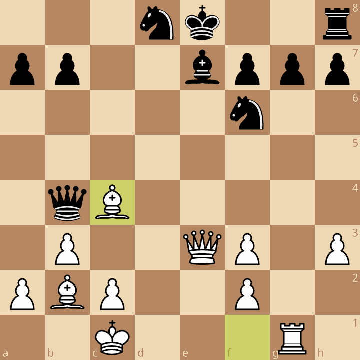 Een paar zetten later werd bovenstaand diagram bereikt. Zwart zijn koning bleef wel in het midden staan en de lopers en toren op g1 hadden mooie open lijnen. Maar de zwarte koning wist zich langzaam in veiligheid te brengen via Kf8, g6, Kg7. Toen bleek het stuk meer snel de doorslag te geven. Een belangrijke overwinning dus voor een van de kanshebbers.