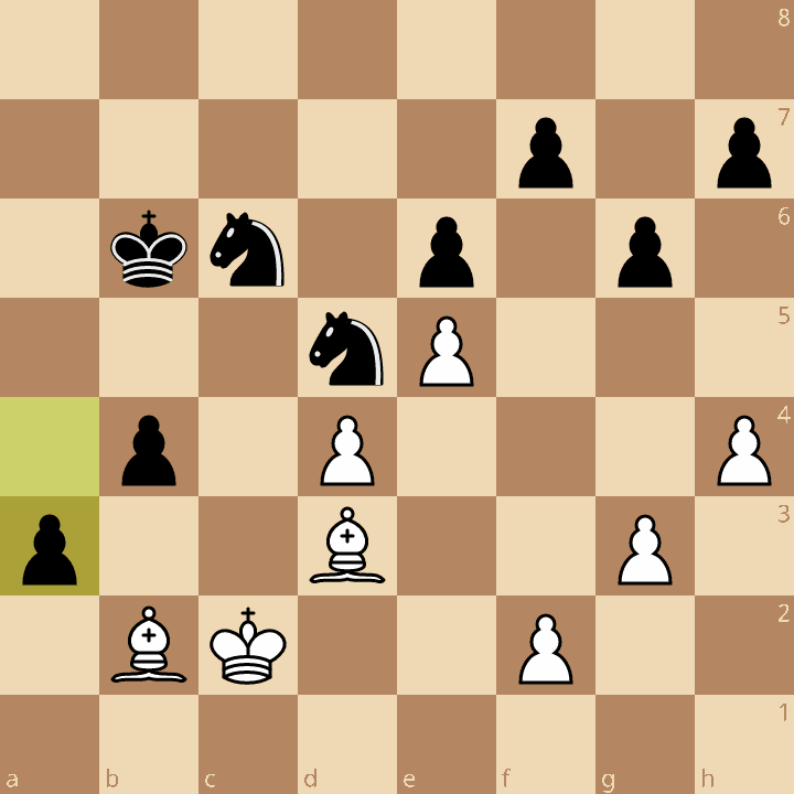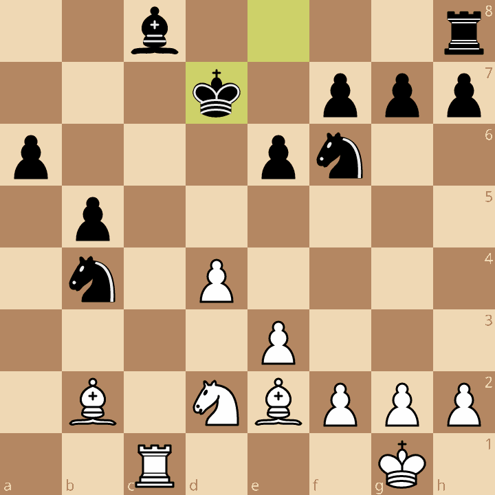 Wit koos er voor om een pion te offeren voor initiatief. In onderstaande stelling had dat initiatief nog vorm kunnen krijgen door 22.Pb3 en dan rustig met f3, e4, Kf2-Ke3 opbouwen. Zoals het ging kreeg zwart na 22.e4 Lb7 23.e5?! Pfd5 ook nog veld d5 tot zijn beschikking kon zwart verder afwikkelen om zijn extra pion. Nadat er nog wat stukken werden geruild kwamen de Noteboom pionnen in beweging (zie onderstaande diagram) wat tot de overwinning leidde.