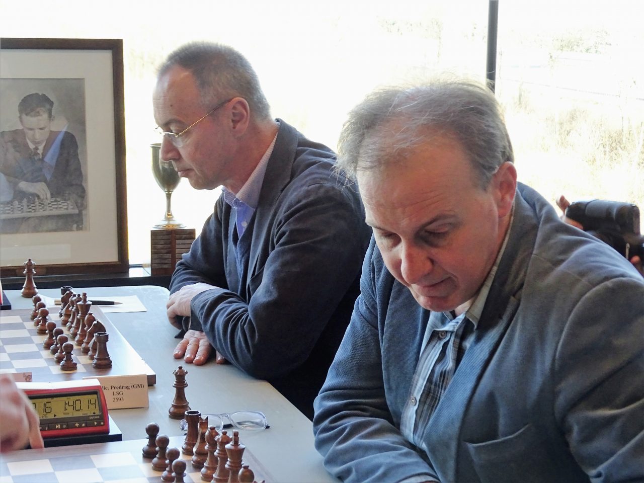 De overige twee grootmeesters moesten er wel flink voor werken. Benjamin Bok versloeg met wit LSG-troef Mark van der Werf. In een Spaanse Zaitsev maakte zwart vrij makkelijk gelijk, maar speelde daarna het eindspel erg onhandig. Dat moet je tegen zo’n sterke grootmeester natuurlijk niet doen en Bok bouwde zijn voordeel dan ook langzaam maar zeker uit en kwam na een lange strijd ook op 3 uit 3. De laatste die zich bij het leidende viertal voegde, was Predrag Nikolic. Stefan Bekker zette de boel rustig op maar kon niet voorkomen dat zwart toch in het voordeel kwam. De witspeler verdedigde echter stug en uiteindelijk kwam er een eindspel van K+T+L vs K+T op het bord. Theoretisch remise, maar in de praktijk best lastig. Maar toch ook weer niet zo lastig dat je je mat in 1 moet laten zetten… Dat gebeurde echter wel waardoor ook Nikolic op 100% blijft staan.