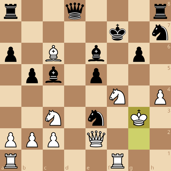 Jurriaan begreep dat dit wel eens een kritieke stelling kon zijn en dacht lang na. Hij zette hier de creativiteit accelerator aan maar misschien net een tikje te veel. 17.Pxh5? was namelijk iets te veel van het goede. Na het eenvoudigere 17.Lxf4 of desnoods eerst 17.Pf5 blijft de stelling in evenwicht. Het valt daarbij wel op dat de zwarte stelling een stuk steviger staat dan dat ik in ieder geval zou denken. In de partij volgde 17..fxg5 18.e5 (nog maar eens wat lijnen openen) 18..dxe5 19.Lxf4 gxf4 (Rick pakt rustig alles wat hij aangeboden krijgt. Intimideren moet het daarbij zijn lijkt me voor zijn tegenstander dat hij daar ook niet heel lang over nadenkt.) 20.Lc6+ Kf7 21.Pxf4 Lc5+ 22.Kg2 Pe3+ 23.Kg3 blijkt het echter de witte koning te zijn die als eerste sneuvelt.
