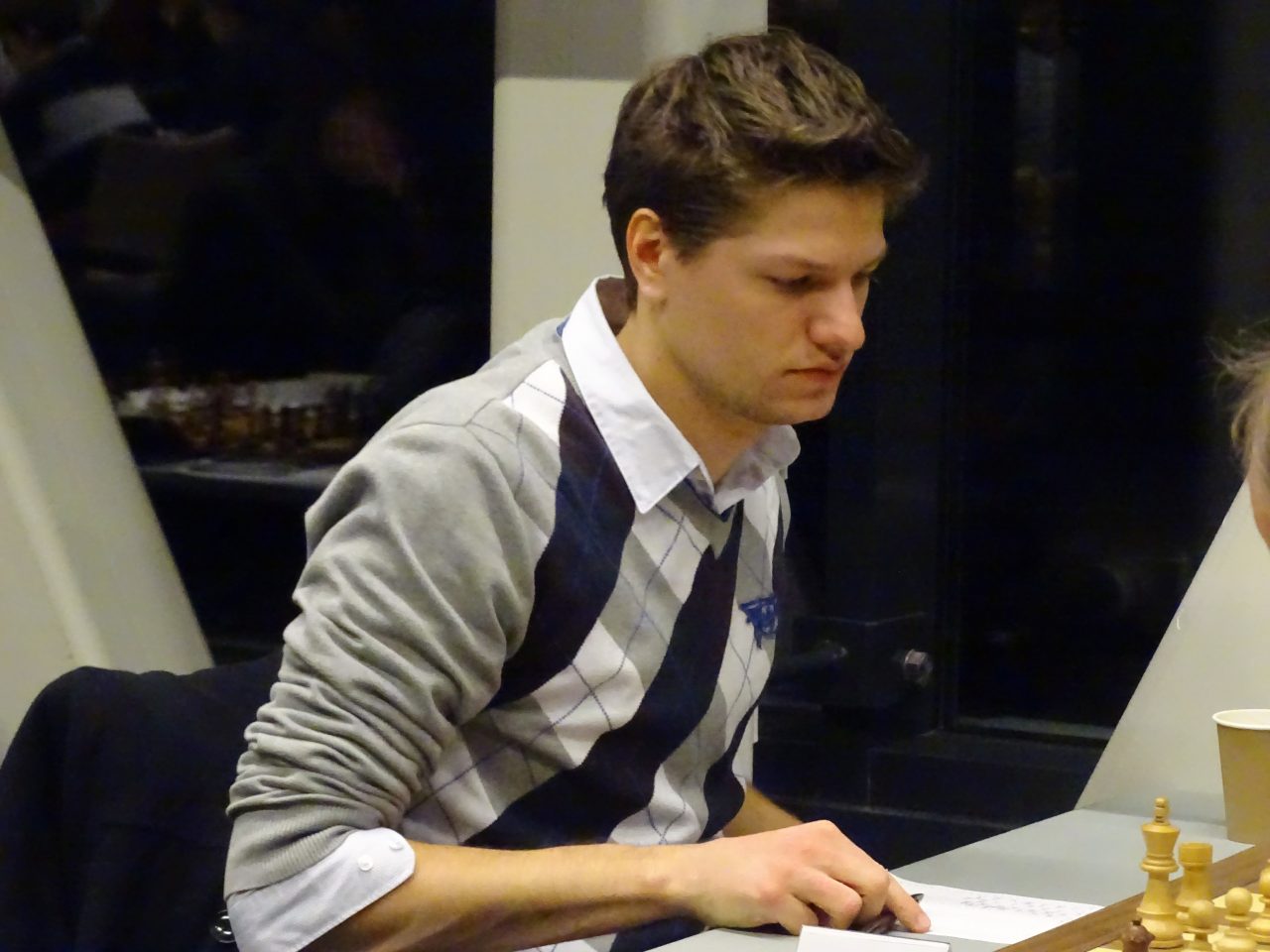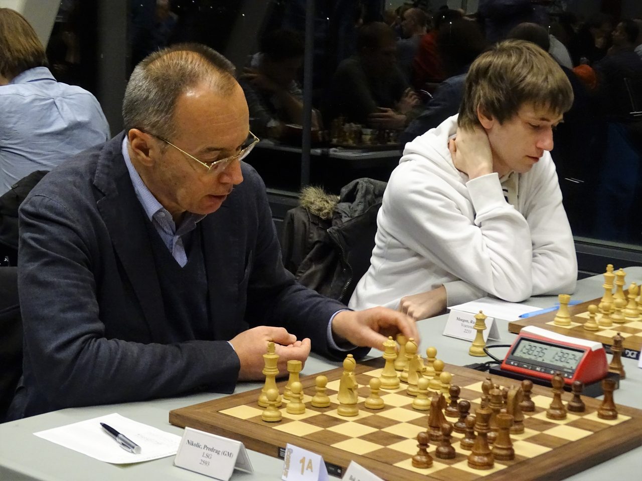 Het allereerste resultaat van de avond was de vlotte remise tussen 2 van de 4 koplopers. De nummers 1 en 2 van de ratinglijst wilden elkaar geen pijn doen en werden al snel weer gesignaleerd in de bar. Predrag stelde op zet 11 voor om het punt te delen en Benjamin zag geen reden om dit te weigeren. Benjamin was daarna nog wel bereid om even te gaan snelschaken tegen een heel jong spelertje dat waarschijnlijk niet eens wist dat het ratingverschil wel eens zo’n 2000 punten kon bedragen.