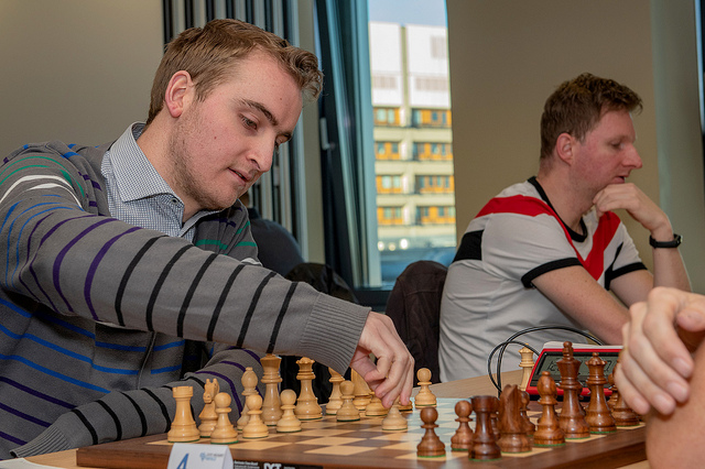 Hier hadden we bij het begin van de ronde acht (!) koplopers. Aan het eerste bord won Lorin Arnold met zwart van Karolina Pomorska en hij zal in de laatste ronden dus gaan strijden om de hoofdprijs. Over geluk had hij hierbij niet te klagen, want een zet voor het eind staat wit nog gewonnen.