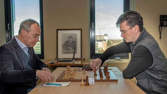 In de A-groep stond het grootmeesterlijke duel op het programma. Predrag Nikolic nam met wit niet al te veel risico tegen Loek van Wely. In rap tempo werden de stukken geruild en in het toreneindspel had wit wel een pluspion, maar had zwart verder weinig moeite om de remise veilig te stellen. Zo leek het in ieder geval. Zwart speelde het niet op de handigste manier en ging uiteindelijk toch nog de fout in waardoor de LSG-er als enige koploper de slotronde in gaat. Zo zie je maar dat toreneindspelen zelfs voor de allersterkste spelers nog best lastig kunnen zijn.